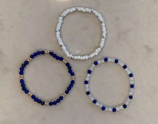 • Blue + 14k Gold Plated Bracelet – Deep blue beads accented with gold for a bold, elegant look.